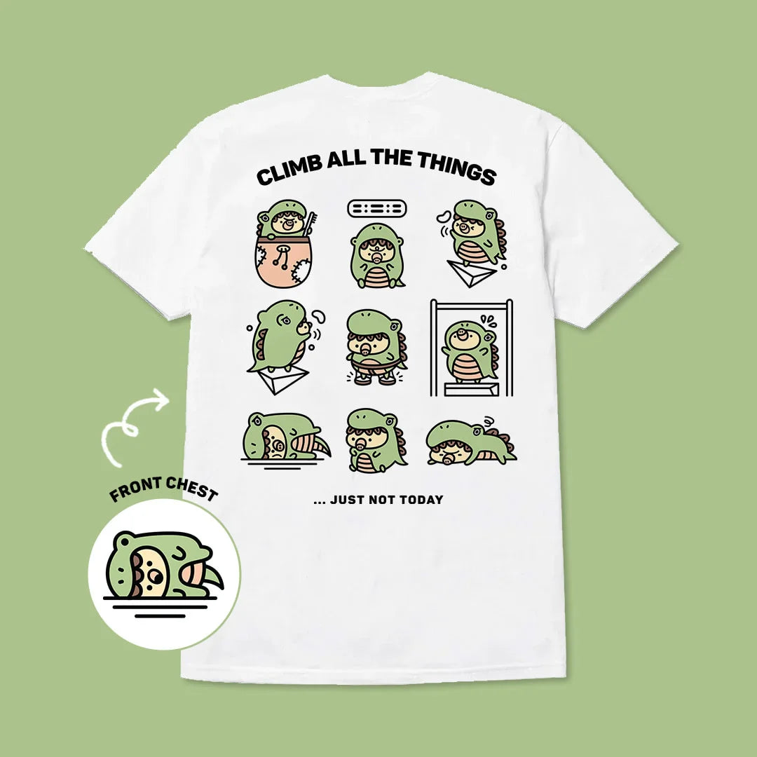 This rock climbing t-shirt features a fun embroidered design on the front chest, and a printed design on the back.